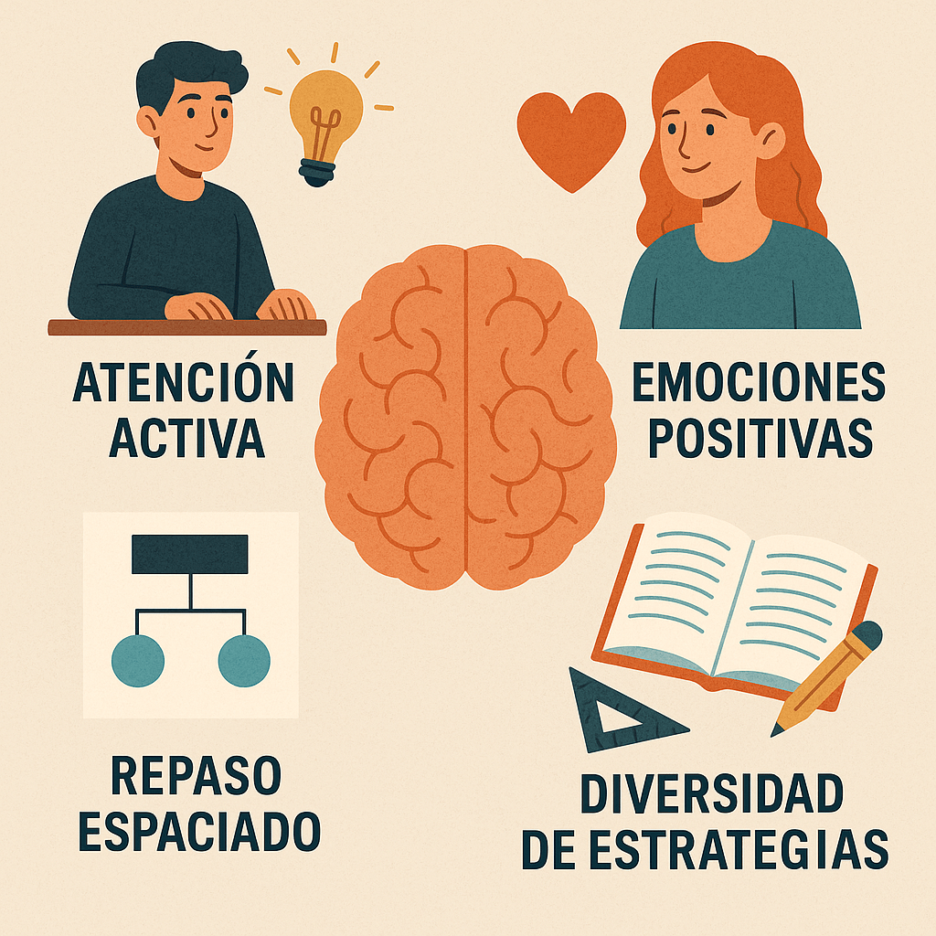 La neurociencia educativa ha demostrado que aprender de forma eficaz requiere atención activa, emociones positivas, repaso espaciado y diversidad de estrategias. Estudiar no consiste solo en repetir datos, sino en establecer conexiones significativas entre lo nuevo y lo conocido. Dibujar esquemas, explicar en voz alta lo aprendido, usar ejemplos reales o alternar distintos tipos de tareas estimula áreas diferentes del cerebro y mejora la retención a largo plazo.