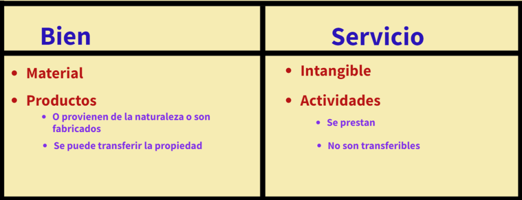 - Los bienes son productos y por lo tanto, o provienen de la naturaleza o son fabricados y además se puede transferir la propiedad, sin embargo, los servicios son actividades que son prestadas por personas y por lo tanto no hay un intercambio físico. Un ejemplo de producto puede ser la mesa que antes hemos hablado, donde la mesa es fabricada y se puede transferir la propiedad, es decir, se puede vender o se puede regalar. Sin embargo, como actividad podemos poner como ejemplo un servicio educativo que son prestados por personas y no hay un intercambio físico, sino que lo que se intercambia es un intangible, que es el conocimiento.