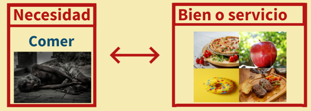Por lo tanto, un bien o un servicio es aquello que permite satisfacer esa carencia. Por ejemplo, si tenemos necesidad de comer, un bien o servicio que puede cubrirla, puede ser, cualquier alimento.