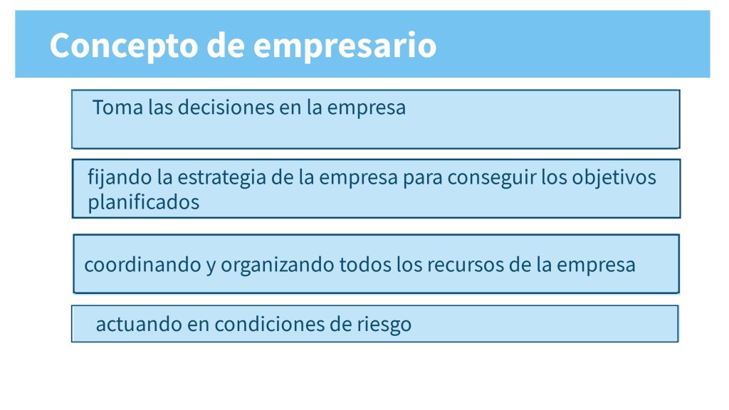 El empresario de una empresa es la persona o personas que gestionan y dirigen la empresa, debe diseñar las estrategias para conseguir los objetivos que se haya planteado, coordinar y organizar los recursos disponibles tomando decisiones y asumiendo en ellas un riesgo.