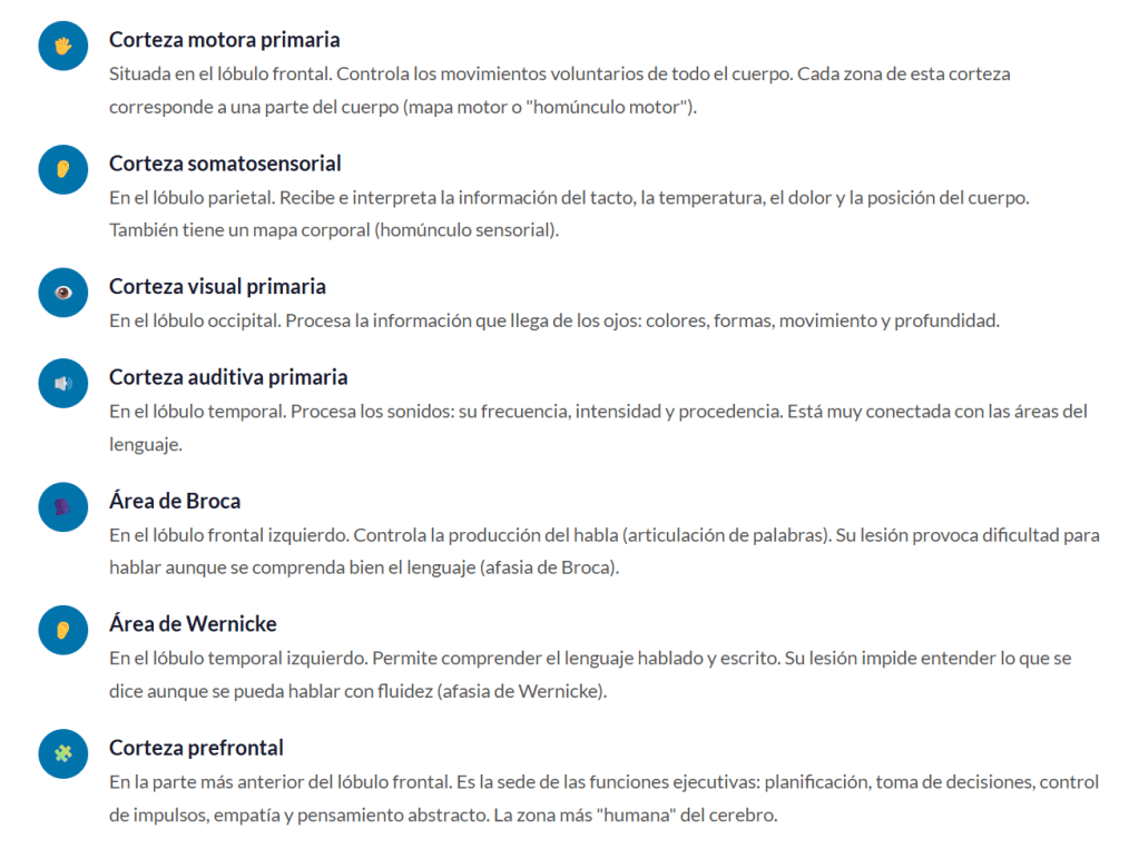 | 🟠 Lóbulo frontal | Cerebro | Razonamiento, planificación, lenguaje expresivo, control de impulsos |