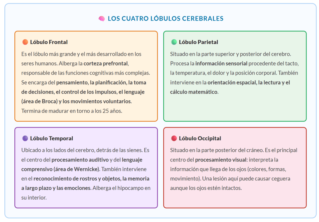 La corteza cerebral de cada hemisferio se divide en cuatro grandes regiones llamadas lóbulos, separados por surcos profundos. Cada lóbulo tiene funciones predominantes, aunque siempre actúan en coordinación con el resto.