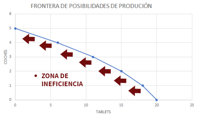 - A la izquierda de la frontera de posibilidades se están utilizando los recursos de forma ineficiente, porque con los mismos recursos podríamos producir más.