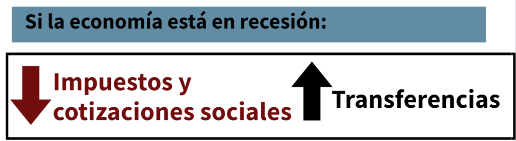 Si la economía está en recesión, tenemos que la economía se contrae, es decir, que el PIB disminuye y por lo tanto van a disminuir los impuestos y las cotizaciones sociales, ya que el desempleo aumenta y el consumo y la inversión disminuyen, pero por otro lado, como hay más gente desempleada, va a haber más gente que va a necesitar ayudas sociales, es decir el gasto público en transferencias aumenta. Aumentará el déficit, pero también hará que la caída del PIB no sea tan profunda, ya que las transferencias harán de freno a la caída del consumo.