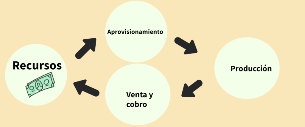 - Venta y cobro, una vez que tenga los recursos producidos, los venderá y cuando cobre estos productos recuperará el dinero y así podrá volver a comprar materiales, volver a almacenarlos, volver a producirlos, volver a venderlos, cobrara y volverá a tener los recursos.