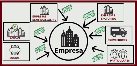 Como se puede ver en la imagen, la financiación externa puede provenir de distintas fuentes como de los socios, de entidades financieras como bancos, de los proveedores, o de particulares.