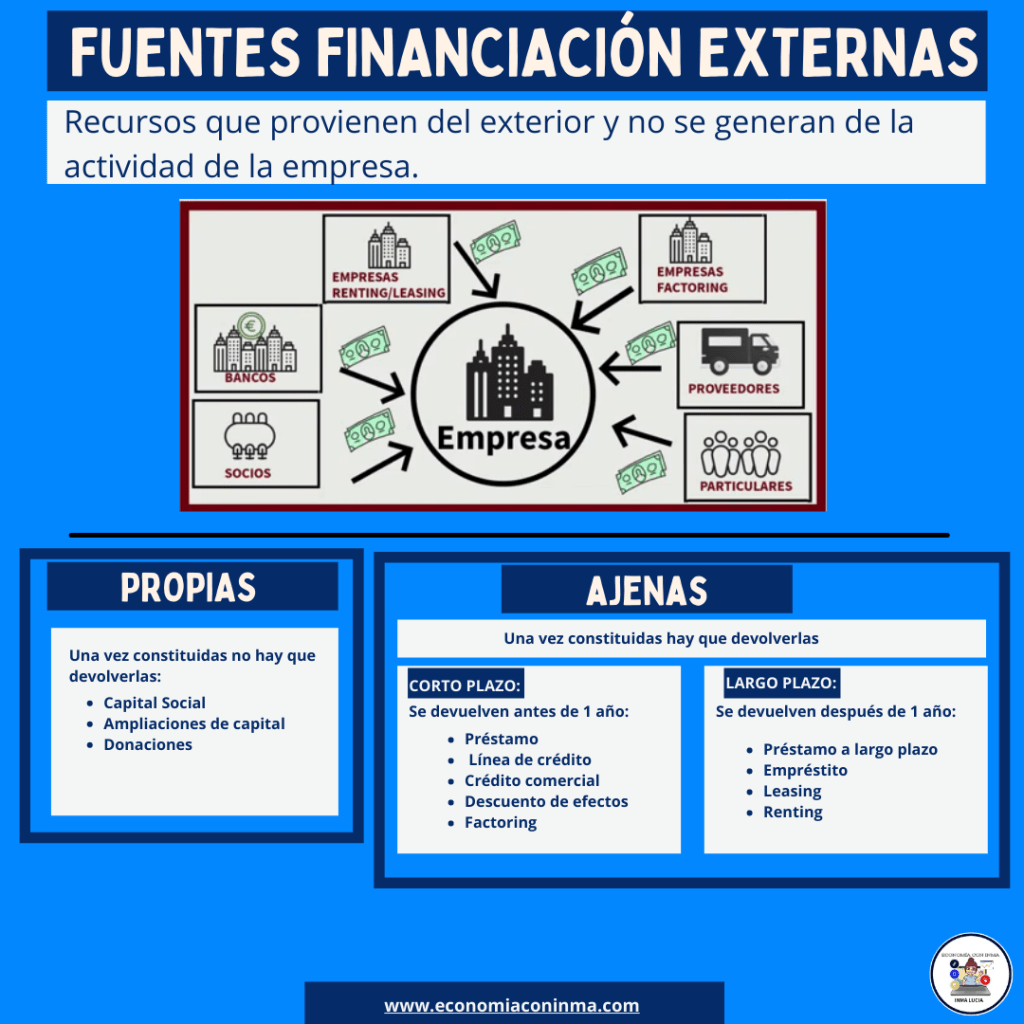 Las fuentes de financiación externas son aquellas que no proceden de la actividad de la empresa, es decir que no se generan de los beneficios, sino que proceden del exterior de la empresa.