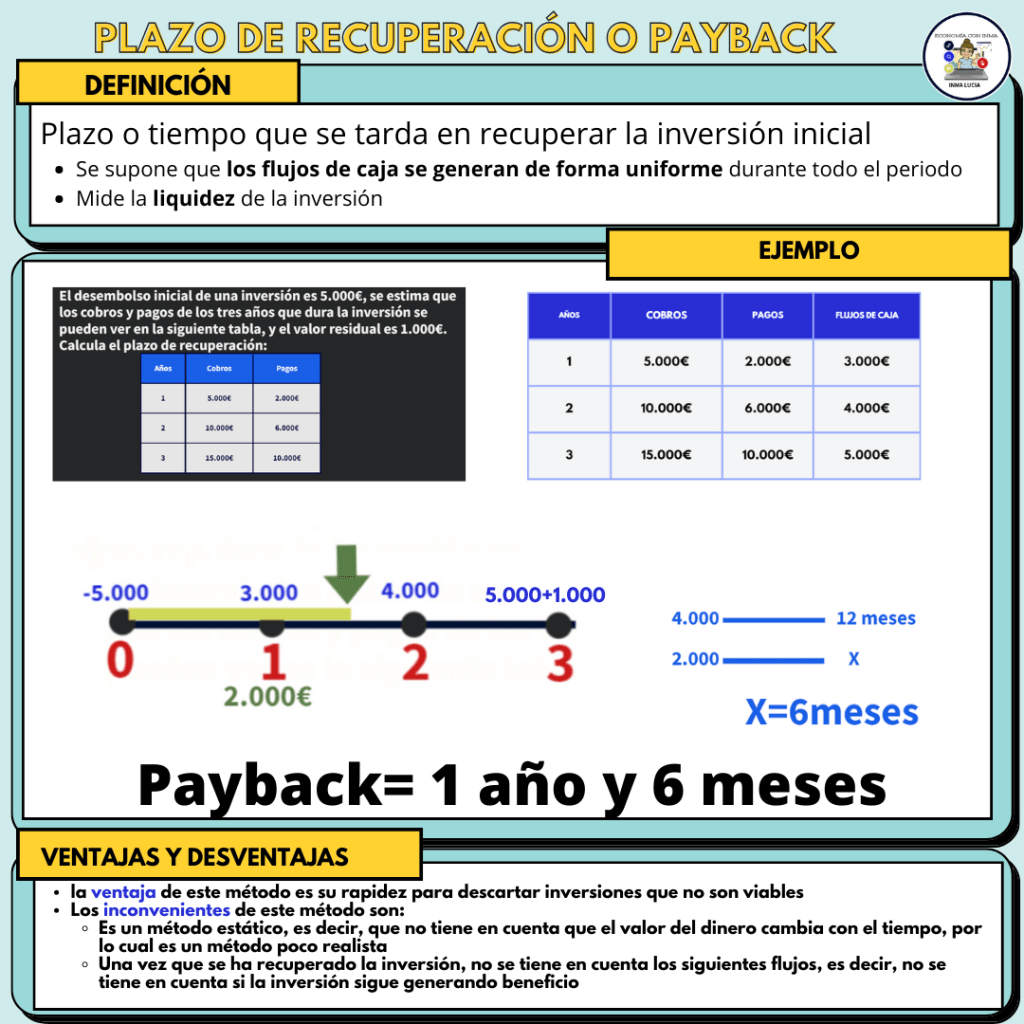 Este método mide la liquidez de la inversión, es decir, que cuanto antes se recupera la inversión, más líquida es la inversión y por lo tanto será la que elijamos entre varias opciones.
