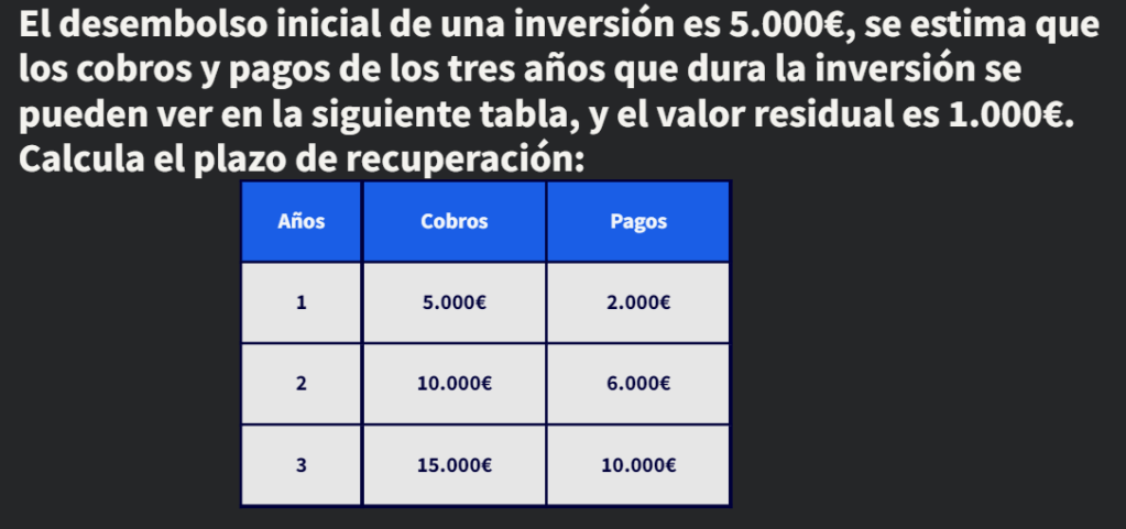 El segundo año se generan 4000 euros, pero para recuperar la inversión inicial solo me hacen falta 2.000€, por lo que el plazo de recuperación estará entre el primer y segundo año, es decir se recuperará en un año y pico.