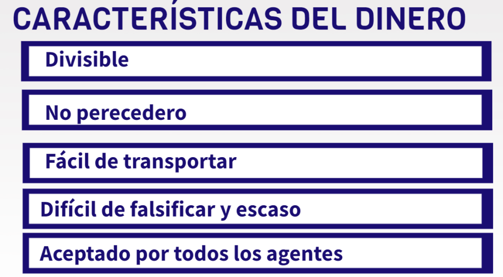 Para que esto sea así y un bien pueda realizar las funciones del dinero, se tienen que cumplir las siguientes características: