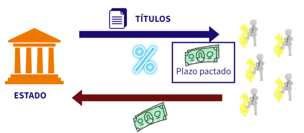 En el caso del Estado emite títulos de deuda pública, que son comprados por los inversores a cambio de un interés fijado de antemano y la devolución del capital o del principal en el plazo pactado.