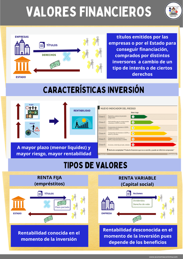 Dentro de los productos financieros más utilizados son, por un lado, los valores de renta fija o empréstitos, donde las empresas y el Estado, principalmente el Estado, emiten títulos de deuda y los valores de renta variable o valores donde los inversores se hacen propietarios de la empresa mediante la compra de una participación en el capital social.