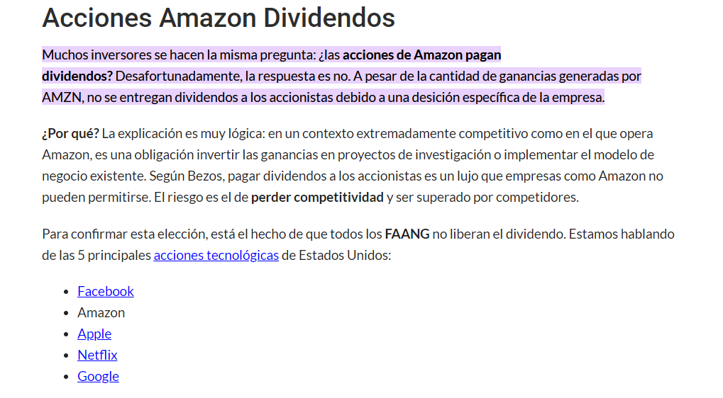 Hay empresas como Facebook o Amazon que no reparten dividendos, es decir, no reparten los beneficios que obtienen, por lo que el inversor que compra esas acciones lo hace con la esperanza de que ganen valor, es decir, que su precio de venta sea superior al precio al que compraron las acciones. (Pincha sobre las imágenes para ver las noticias)