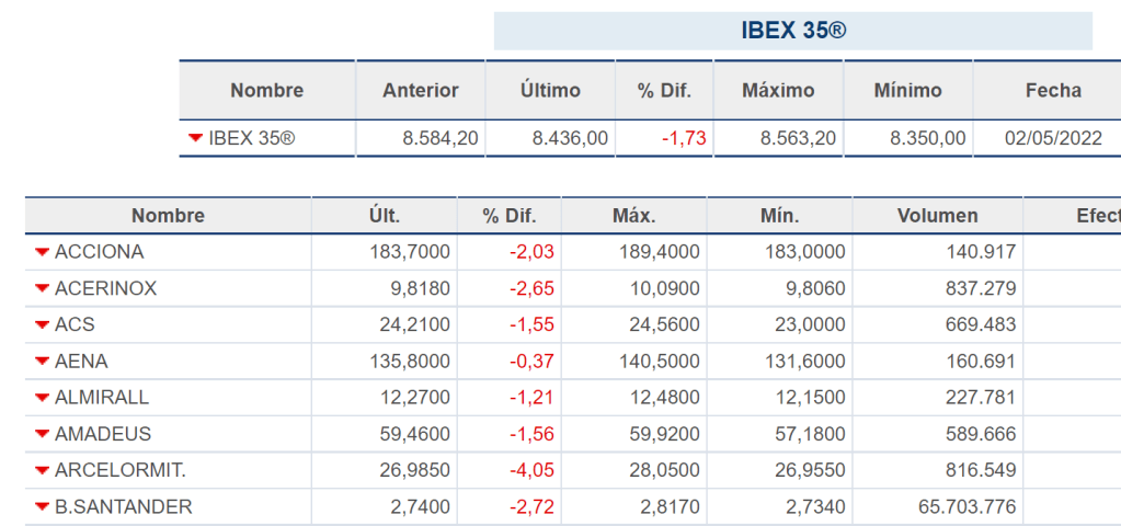 Pinchando sobre la siguiente imagen puedes acceder a web de la bolsa de Madrid con las cotizaciones de las acciones de las empresas que forman el IBEX 35: