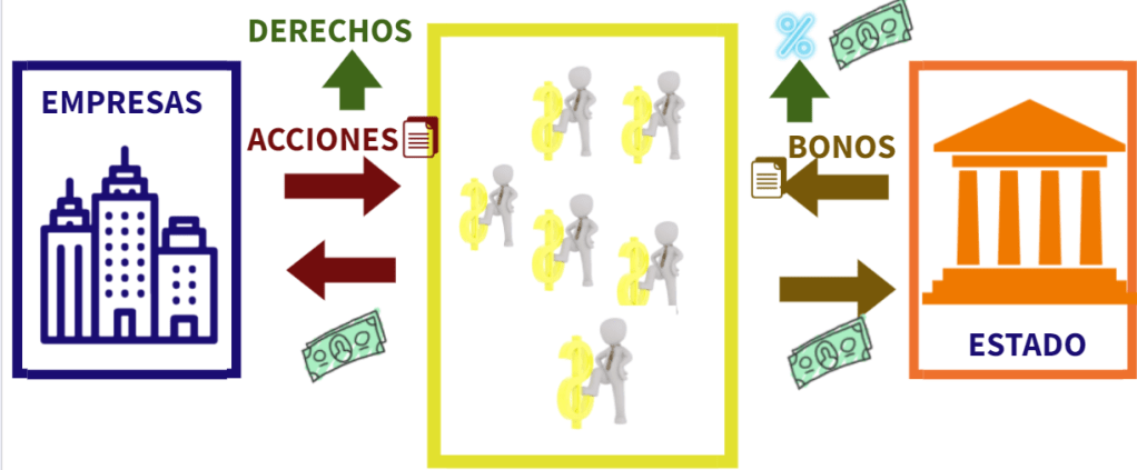Las empresas, consiguen financiación en este mercado principalmente mediante la venta de acciones a cambio de ciertos derechos, como puede ser la participación en el reparto de beneficios y el Estado consigue financiación a través de la venta de títulos de deuda pública, que para simplificar agruparemos todos los tipos bajo el nombre de bonos, con su venta el estado consigue financiación a cambio de un interés y de devolver el dinero prestado en el plazo estipulado.