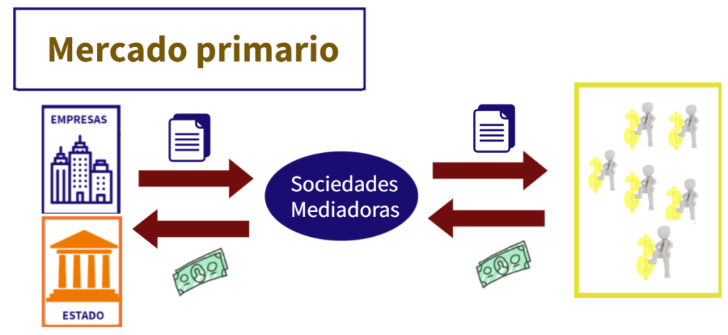 En el mercado primario tenemos que las empresas y el Estado emiten los títulos por primera vez y estos títulos son comprados por las sociedades mediadoras que los hacen llegar a sus clientes.