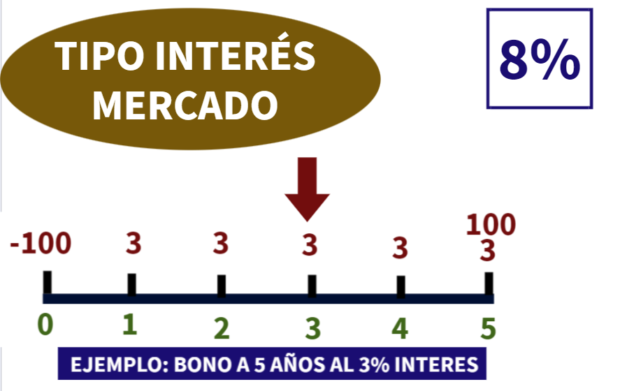 Por lo tanto, si el comprador compra el título a 100 €, obtendría una rentabilidad del 3%. pero sin embargo, si invierte en cualquier otra inversión del mercado, tendría una rentabilidad media del 8%. Por lo tanto, ningún comprador compraría algo al 3% si puede conseguir un 8%. Para poder acceder a comprar el bono al 3% pedirá una rebaja del nominal del bono es decir de los 100€, esa rebaja debe compensar el diferencial de interés perdido, por lo que en vez de pagar 100 €, que es lo que costó el título cuando se emitió, se pagará menos de 100 €.