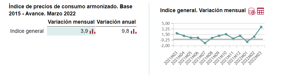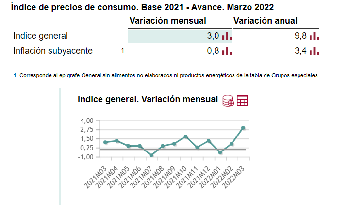 Si vamos a los datos del INE podemos ver que la tasa de variación anual del índice de precios de consumo de marzo de 2022 tomando como base el año 2021 (en avance) fue del 9,8%, es decir que de media los productos consumidos han subido un 9,8% de marzo de 2021 a marzo de 2022 y respecto de febrero de 2022 ha subido un 3%.
