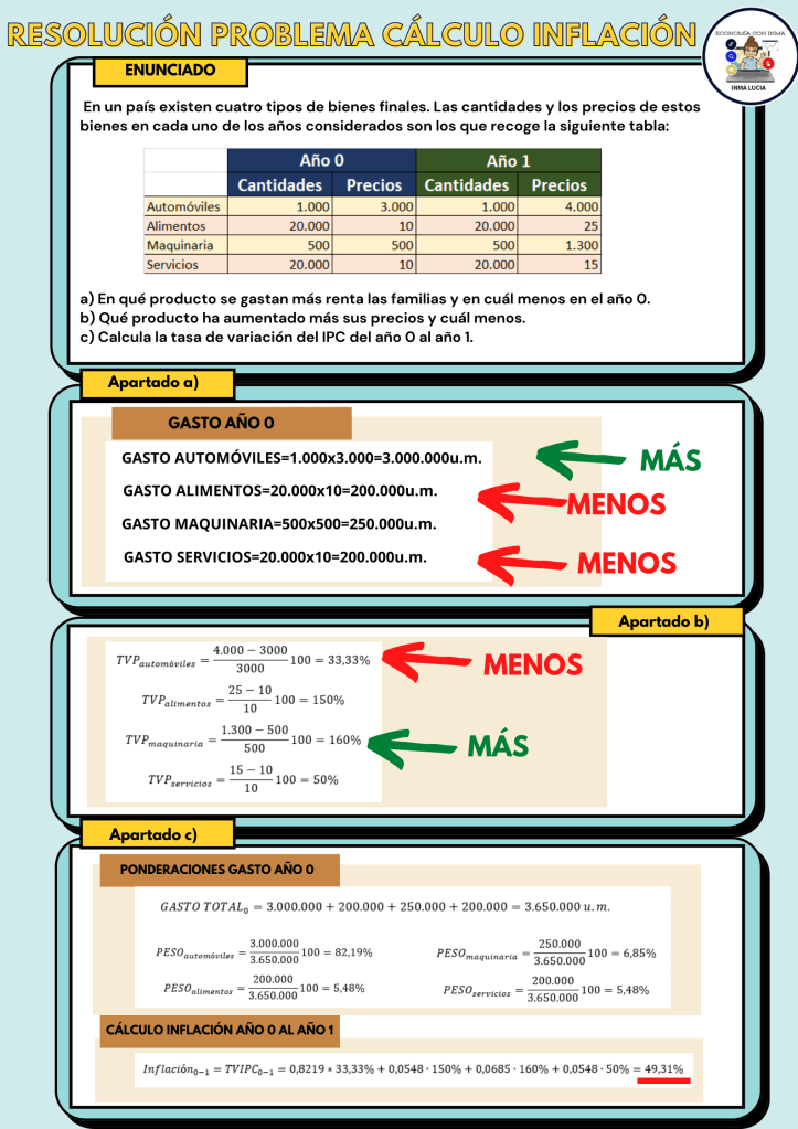 En el próximo apartado, realizaremos problemas de cálculo del IPC y de su variación, no obstante puedes ver el vídeo, hacer el edpuzzle o ver la infografía de un problema de cálculo de la inflación para ver si lo has entendido: