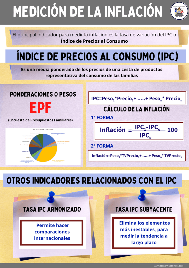 Para medir la inflación se pueden utilizar distintos indicadores, como ya vimos en un apartado anterior, se podría utilizar el deflactor del PIB como indicador de la variación de los precios de los productos de una economía, pero el principal indicador que se usa es el IPC o el Índice de precios al consumo, que es un indicador que mide el Instituto Nacional de Estadística (INE) y para elaborarlo utiliza la Encuesta de Presupuestos Familiares (EPF).