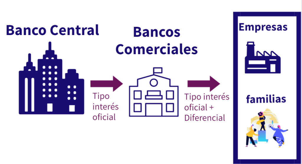 A través de los préstamos del Banco Central Europeo a los bancos comerciales, se fija el tipo de interés de referencia que luego los bancos comerciales, al prestar a empresas y familias, cobrarán este tipo de interés oficial más un diferencial.