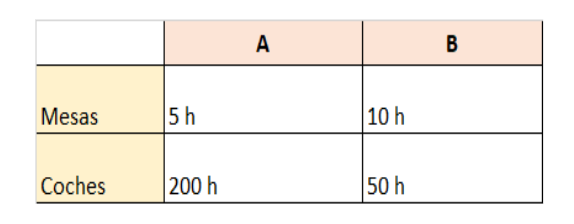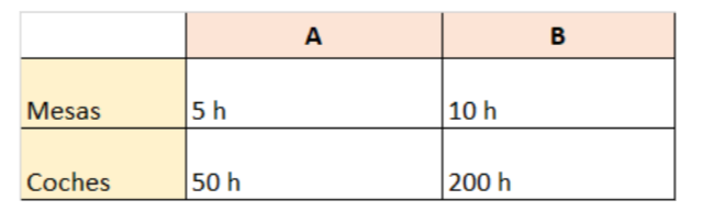 Veamos un ejemplo, tenemos dos países, un país A y un país B, y ambos pueden producir mesas o coches, según la siguiente tabla que indica las horas necesarias que necesita cada país para producir una mesa o un coche:
