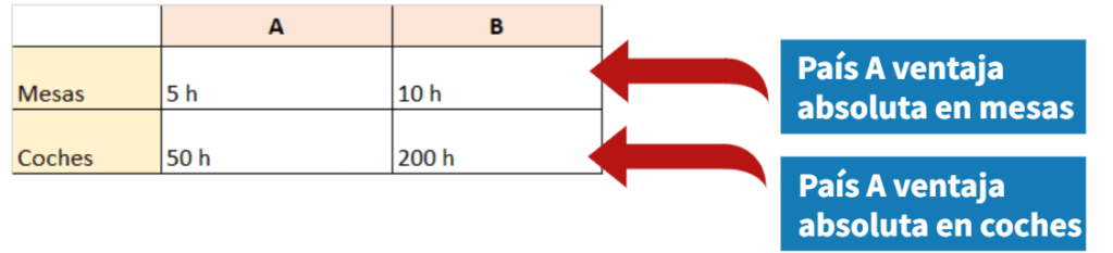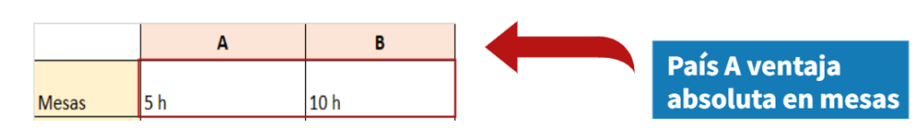 El país A para producir una mesa utiliza cinco horas de trabajo y el país B para producir una mesa utiliza diez horas de trabajo, por lo que el país A utiliza menos horas de trabajo que B para producir una mesa. Es decir, que el país A tiene ventaja absoluta en la producción de mesas.
