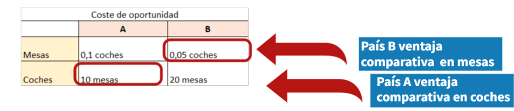 Resumiendo, el país A se debe especializar en coches porque el coste de oportunidad de fabricar un coche en términos de mesas es menor y el país B Se debe especializar en fabricar mesas porque el coste de oportunidad en términos de coches es menor y una vez que el país a dedique sus recursos a producir coches y el país B dedique sus recursos a producir mesas, podrán intercambiarlos siendo el número de productos al que puede acceder cada país mayor que si no hubiera intercambio.