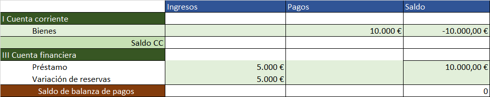 Por otro lado, en la cuenta financiera tenemos que nos hemos financiado mediante un préstamo del extranjero con 5.000 € y que la variación de reservas ha sido de 5.000 €, que es lo que van a bajar las reservas de divisas al pagar al contado.