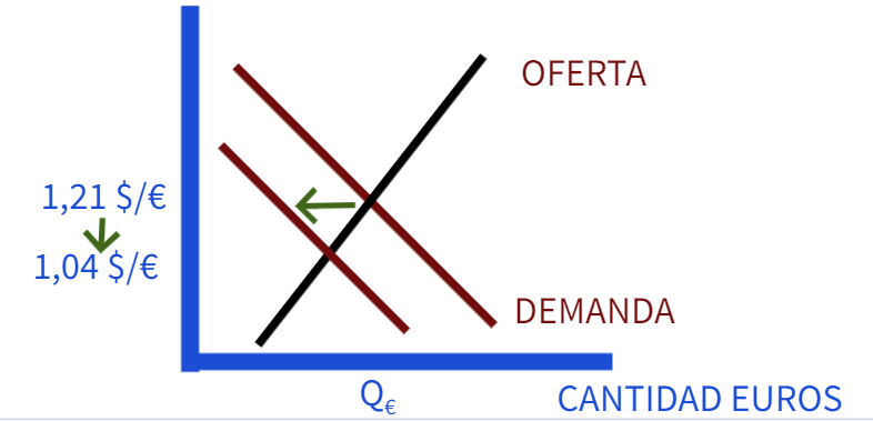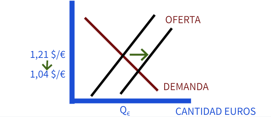 Tenemos que este tipo de cambio puede apreciarse o bien porque aumenta la demanda de euros o bien porque disminuya la oferta de euros.