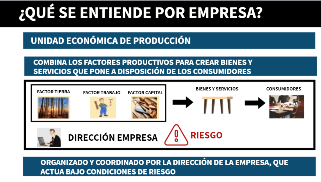 Como vimos en la unidad anterior, una empresa se puede definir como la unidad económica de producción, que combina los factores productivos para fabricar los bienes y servicios que pone a disposición de los consumidores, satisfaciendo las necesidades del mercado, todo ello gestionado por la dirección de la empresa que actúa en condiciones de riesgo, buscando un beneficio.