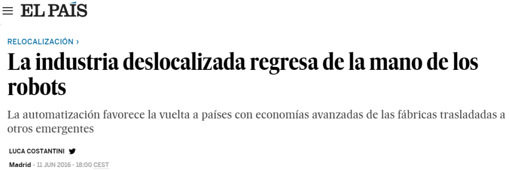 Aunque últimamente debido al avance de la Industria 4.0 y principalmente debido a la automatización y robotización se está empezando a Relocalizar ciertas industrias. Como puedes ver en el siguiente artículo haciendo click sobre el titular