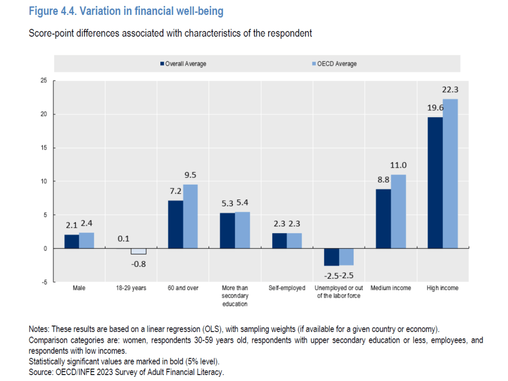 En la siguiente imagen se muestran diferencias de puntuación de bienestar financiero sobre 100, asociados a factores económicos, lo que se ve en esta imagen es que hay una fuerte relación del Bienestar financiero con el nivel de ingresos.