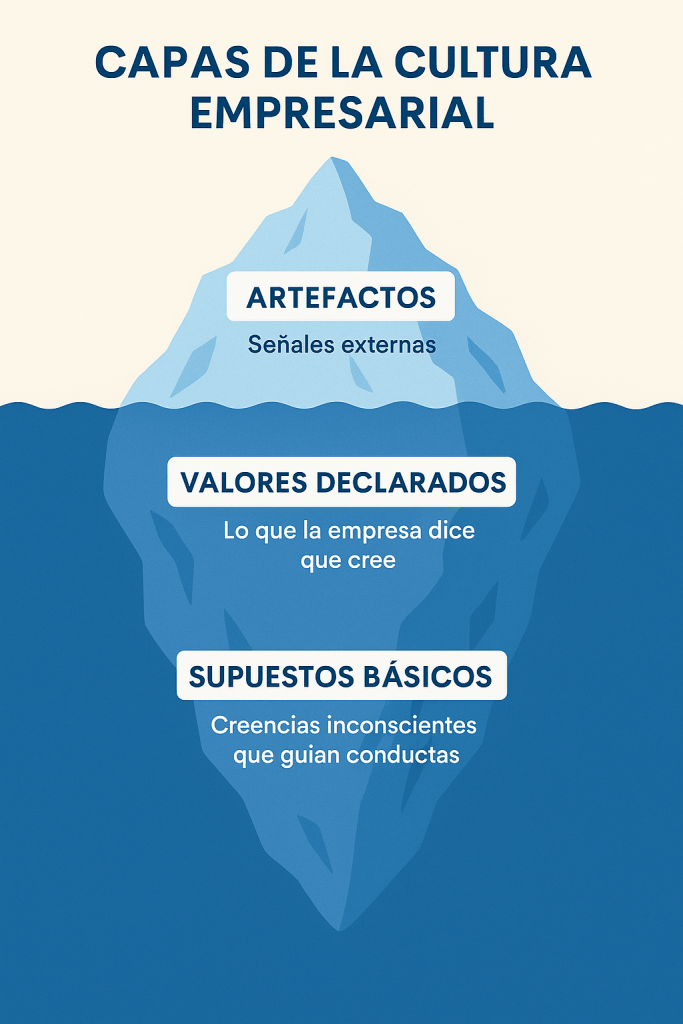 A menudo se compara con un iceberg: la parte visible representa lo que se puede observar (símbolos, lenguaje, rutinas), mientras que bajo la superficie se encuentran los valores y creencias profundas que explican el comportamiento de las personas dentro de la empresa.