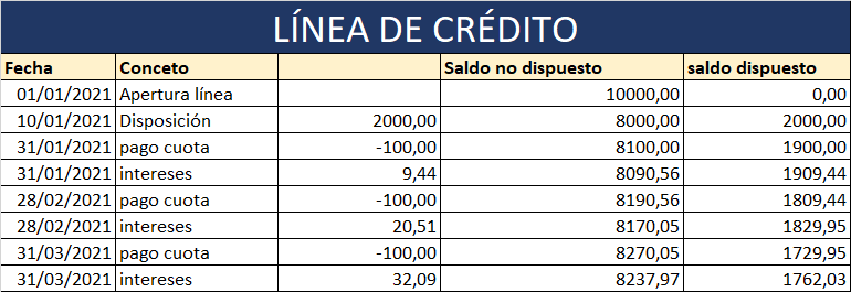 - Funciona como una cuenta corriente donde el saldo disponible es la cantidad que el banco te ha puesto como límite en la línea de crédito que no has usado, es decir, la cantidad que te queda por utilizar. Se suele elegir una cuota a pagar mensual, veámoslo con un ejemplo simplificado, donde no va a haber comisiones, solo interés a pagar por lo dispuesto.
