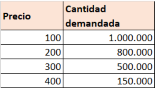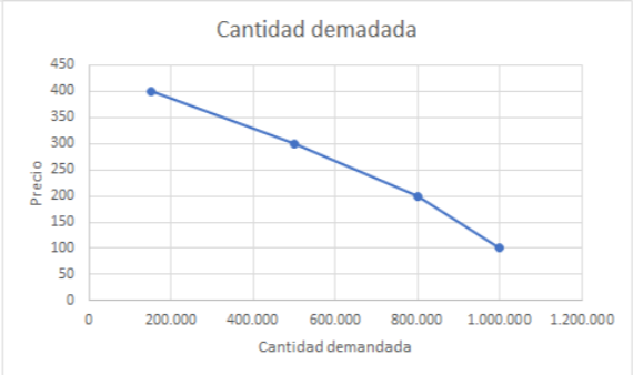 Por ejemplo a un precio de 100u.m., los demandantes estarían dispuestos a comprar 1.000.000 unidades, pero sin embargo a un precio de 400u.m. los demandantes demandarían 150.000 unidades.