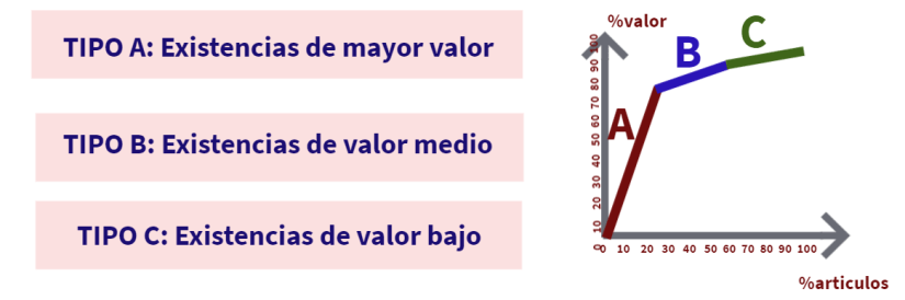 Por lo tanto clasificando las existencias en tres grupos y asignando un distinto tipo e control a cada una de ellas nos hará ganar en eficiencia y reducir costes.