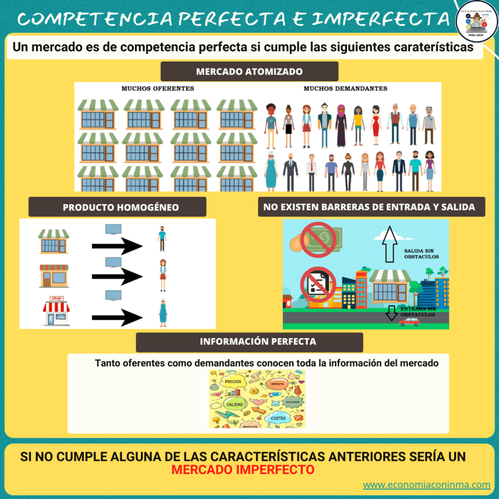 Si se cumplen estas cuatro características estaríamos hablando de un mercado de competencia perfecta y si no se cumple alguna de ellas, estaríamos hablando de un mercado de competencia imperfecta.