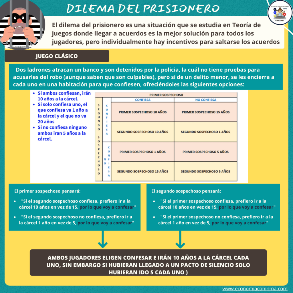 Con el dilema del prisionero se plantea una situación donde llegar a acuerdos es la mejor solución para todos los participantes en el juego, pero individualmente hay incentivos para saltarse los acuerdos.