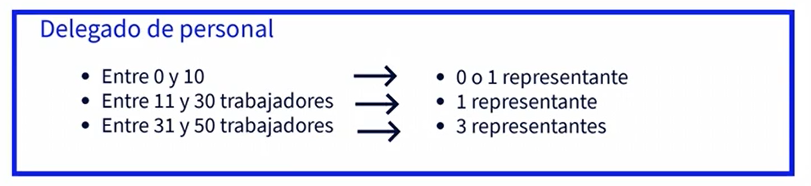 - Delegados de personal: empresas que tienen entre 11 y 50 trabajadores, aunque si la empresa tiene más de seis trabajadores, se puede votar por mayoría que se tenga representantes sindical, cuyo nombre será delegado de personal. Si tiene menos de seis trabajadores no tendrá representante sindical
