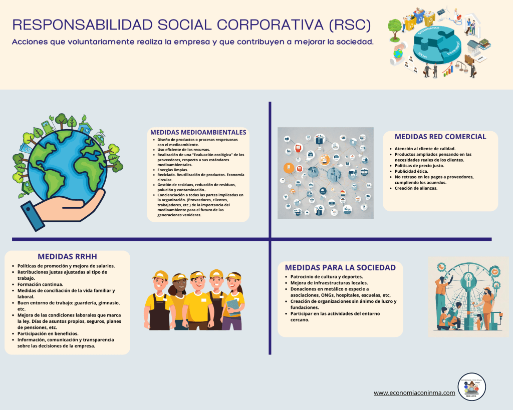 Las medidas o acciones de responsabilidad social que una empresa puede realizar se pueden clasificar en distintos ámbitos, como se puede ver en la imagen con ejemplos de medidas concretas en cada uno de los ámbitos: