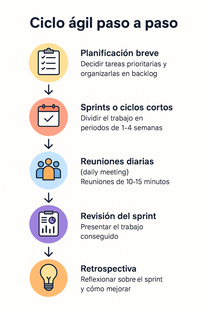 En lugar de grandes planes rígidos, los equipos ágiles trabajan en ciclos cortos, evaluando y ajustando continuamente su trabajo para ofrecer valor al cliente cuanto antes.