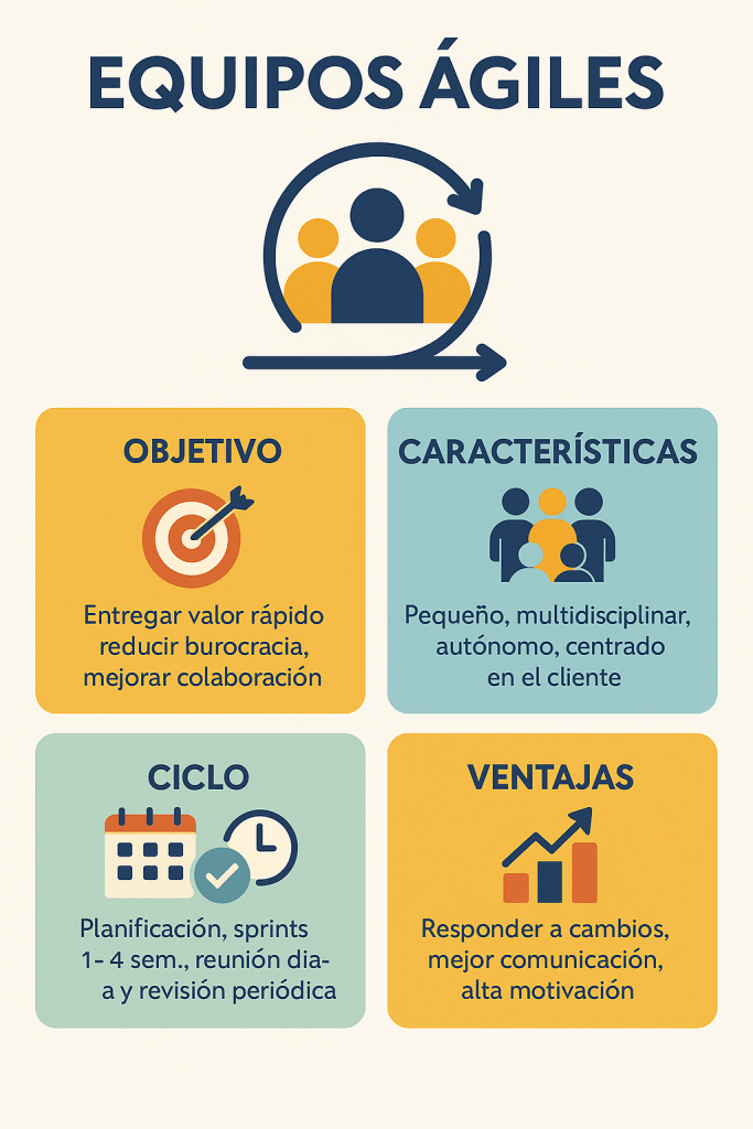 Los equipos ágiles son grupos de trabajo que se organizan de forma flexible, autónoma y muy orientada a resultados. Surgieron en el sector tecnológico, pero hoy se aplican en casi cualquier tipo de empresa porque permiten adaptarse rápidamente, trabajar mejor en equipo y mejorar la calidad del producto o servicio.