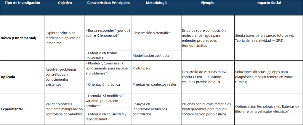 Aplicada → Implementa soluciones (ej: Granjas solares flotantes [2020s])