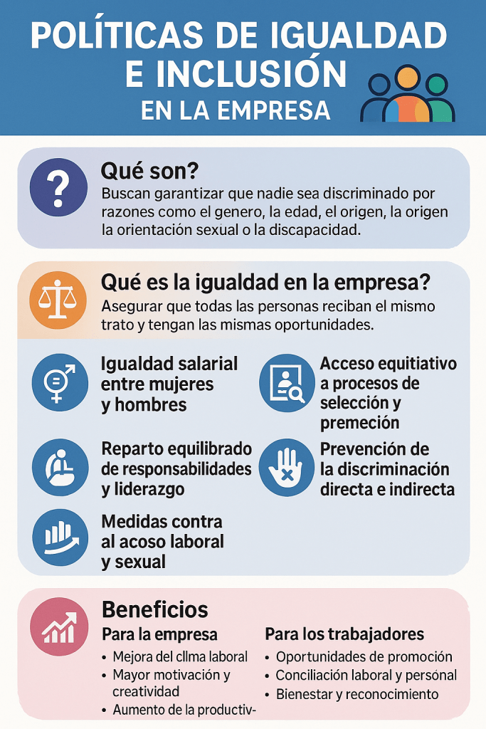 En la actualidad, las organizaciones necesitan algo más que cumplir objetivos económicos: también deben crear entornos de trabajo justos, seguros y respetuosos, donde todas las personas tengan las mismas oportunidades. Las políticas de igualdad e inclusión son un elemento clave dentro de la gestión de Recursos Humanos, ya que influyen directamente en el clima laboral, la motivación, la productividad y la imagen corporativa.
