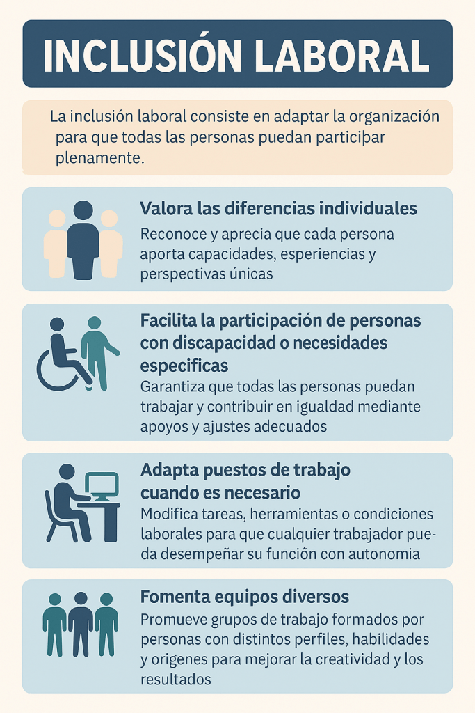 • Facilita la participación de personas con discapacidad o necesidades específicas, garantizando que todas las personas puedan trabajar y contribuir en igualdad mediante apoyos y ajustes adecuados.