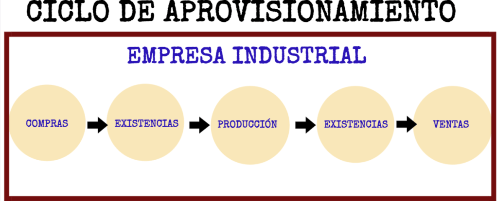 En el caso de una empresa industrial o con un proceso de transformación, el ciclo de aprovisionamiento está formado por las siguientes fases: Compra de materias primas y materiales, almacenamiento de estas existencias, proceso de producción, almacenamiento productos terminados y venta.