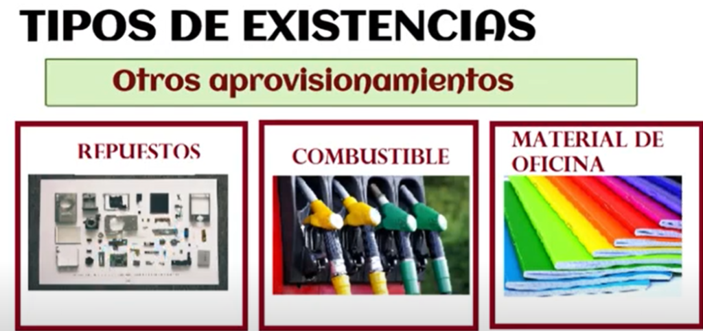 - Otros aprovisionamientos: Existencias que la empresa necesita para llevar a cabo su actividad pero que no se incluyen en las anteriores categorías y que la empresa no los produce. Por ejemplo los repuestos, el combustible o el material de oficina.