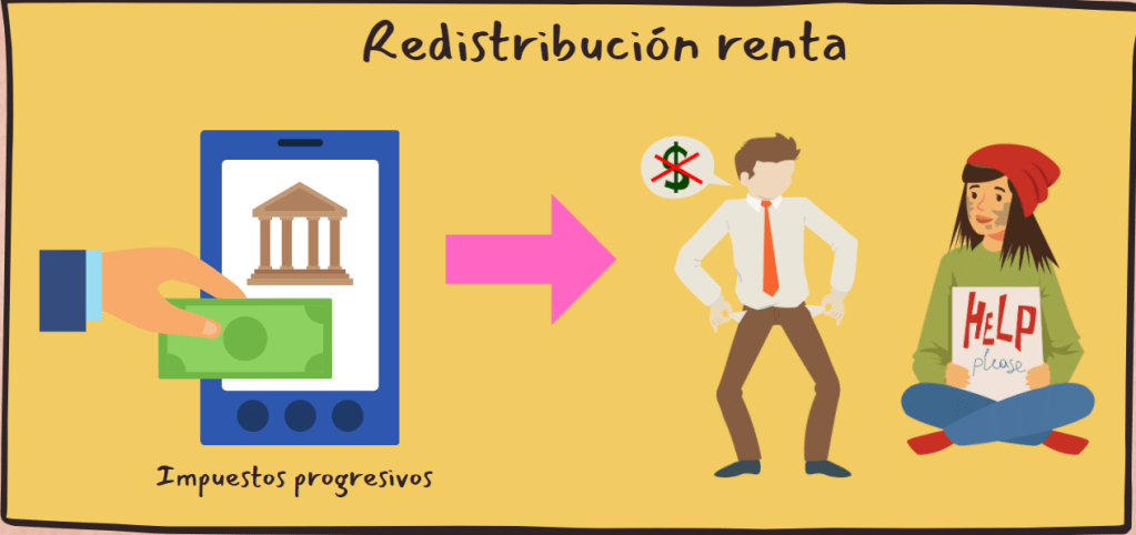 En tercer lugar, tiene que tener un papel redistribuidor de la renta. Es decir, que a través de impuestos progresivos, es decir que pagan más impuestos los que más renta obtienen, se debe conseguir una mayor equidad y justicia social. Por ejemplo, a través de transferencias hacia aquellos estratos de la sociedad que menos riqueza y renta tienen.