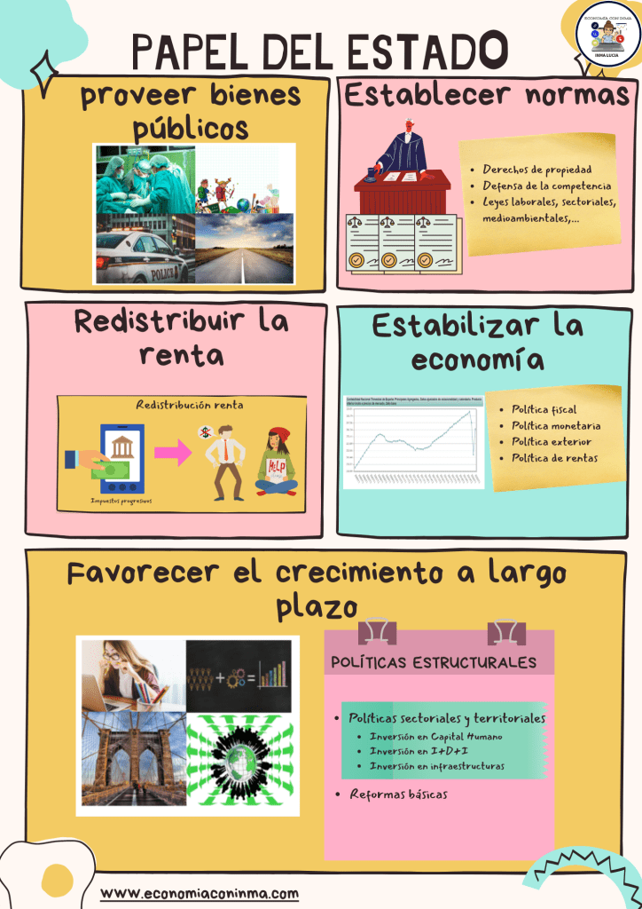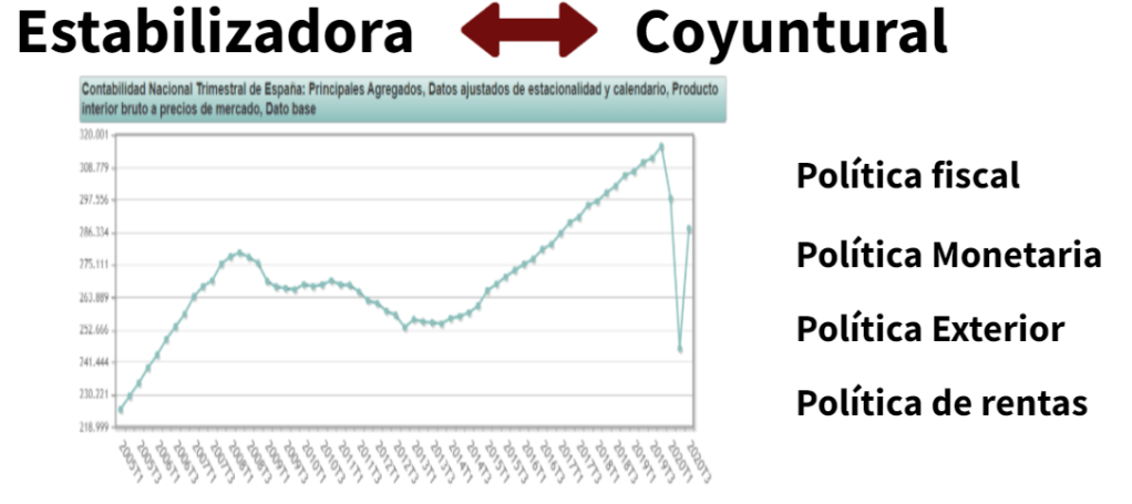 En cuarto lugar, tiene un papel estabilizador. Es decir, que debe intentar suavizar las fluctuaciones de los ciclos económicos para paliar los efectos negativos de estos ciclos. Como puede ser en épocas de recesión, intentar disminuir y luchar contra el desempleo y la destrucción del tejido empresarial o en épocas de expansión y auge, controlar la inflación. A este tipo de políticas estabilizadoras, también se les llama coyunturales porque pretenden actuar en el corto plazo y se toman unas medidas u otras dependiendo de la coyuntura o marcha de la economía.